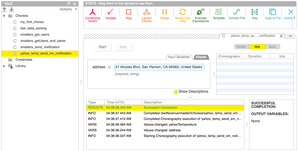 The above choreo takes an address, retrieves the current temperature for that address, then sends an xMatters notification with the temperature information. The snapshots below shows a successful execution of the above Choreo: