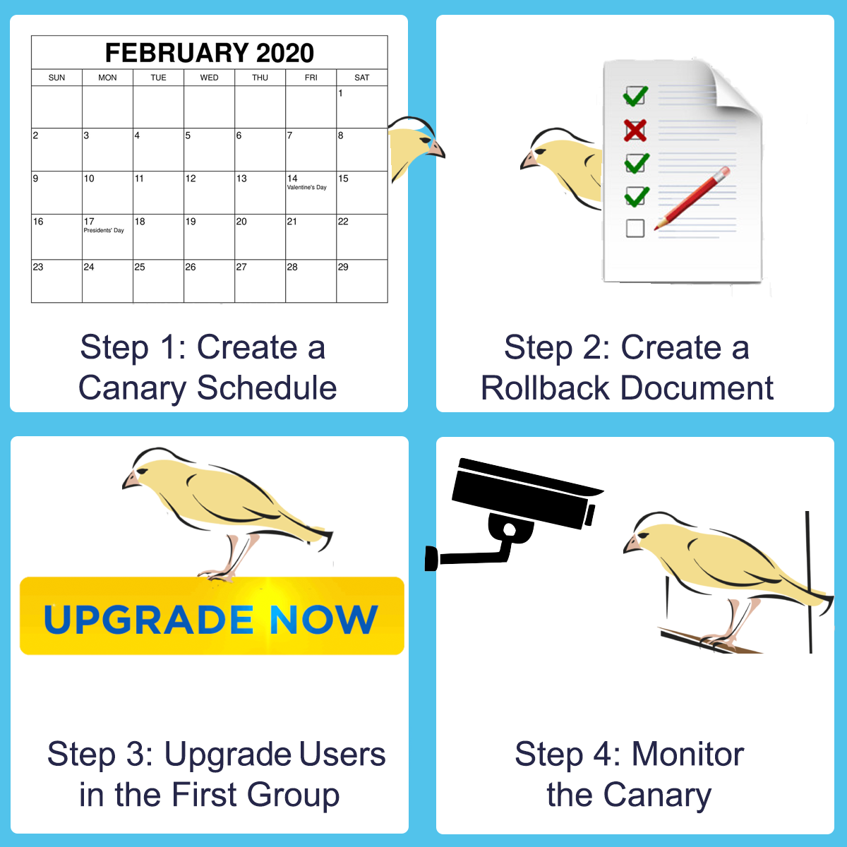 The canary process should be – if you’ll pardon the obvious joke – short-lived, as monitoring and analytics ensure any problems are detected early in the release process. However, it’s possible that an issue exists in a path of the code that’s not covered by QA at the time of the release, and that’s not exercised by all users in the earlier stages. So, keeping the canary process brief between upgrade groups allows you to detect problems quickly. (Though you may be some way into the release before a problem is triggered.)