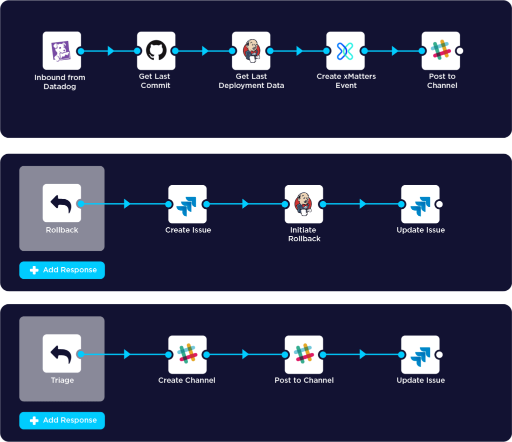 Processes that aren’t documented and practiced risk being forgotten. This can become increasingly worrisome for teams where issue remediation is complex and requires a high degree of precision to complete correctly. xMatters can help organize your DevOps toolchains to create consistent, guided workflows that simplify processes for teams and remove the need for manual or time-consuming processes.