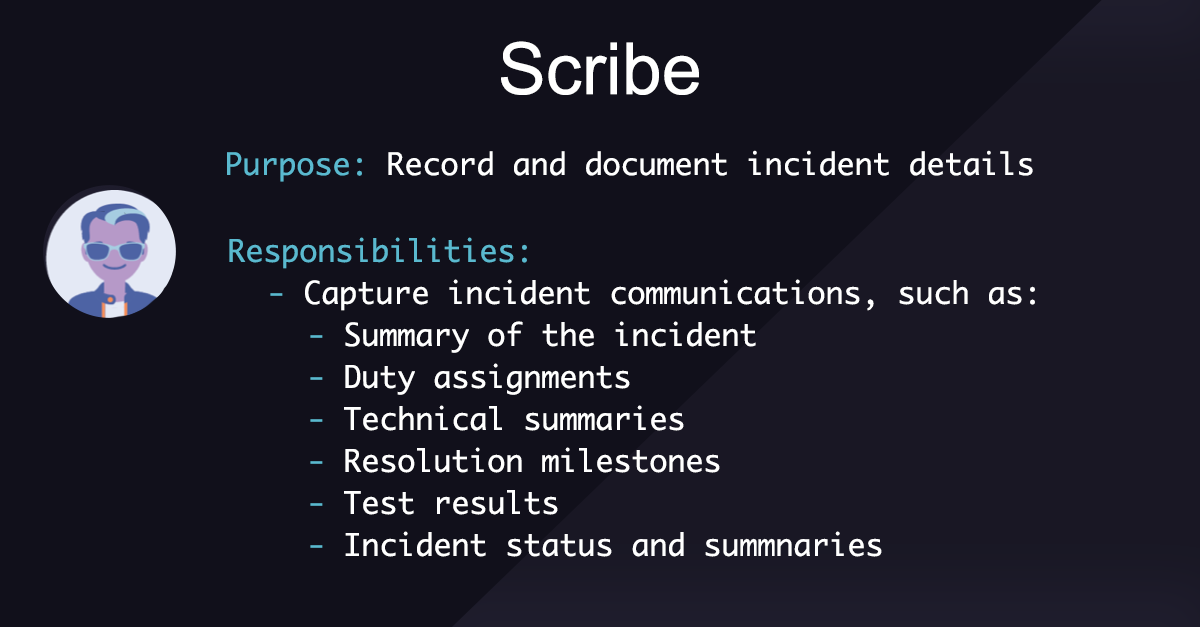 While easy to overlook as it’s more of a documentation role, the scribe becomes invaluable when reviewing the incident and building a root cause analysis. Don’t ignore the value of this role!