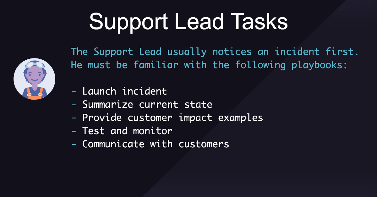 The support lead relays why the incident was called, provides initial testing, and details current impact at the start of the incident. While the incident is in progress, the support lead communicates with customers and stakeholders outside the incident team. The support lead also coordinates testing and advises the incident commander on the current state as needed.