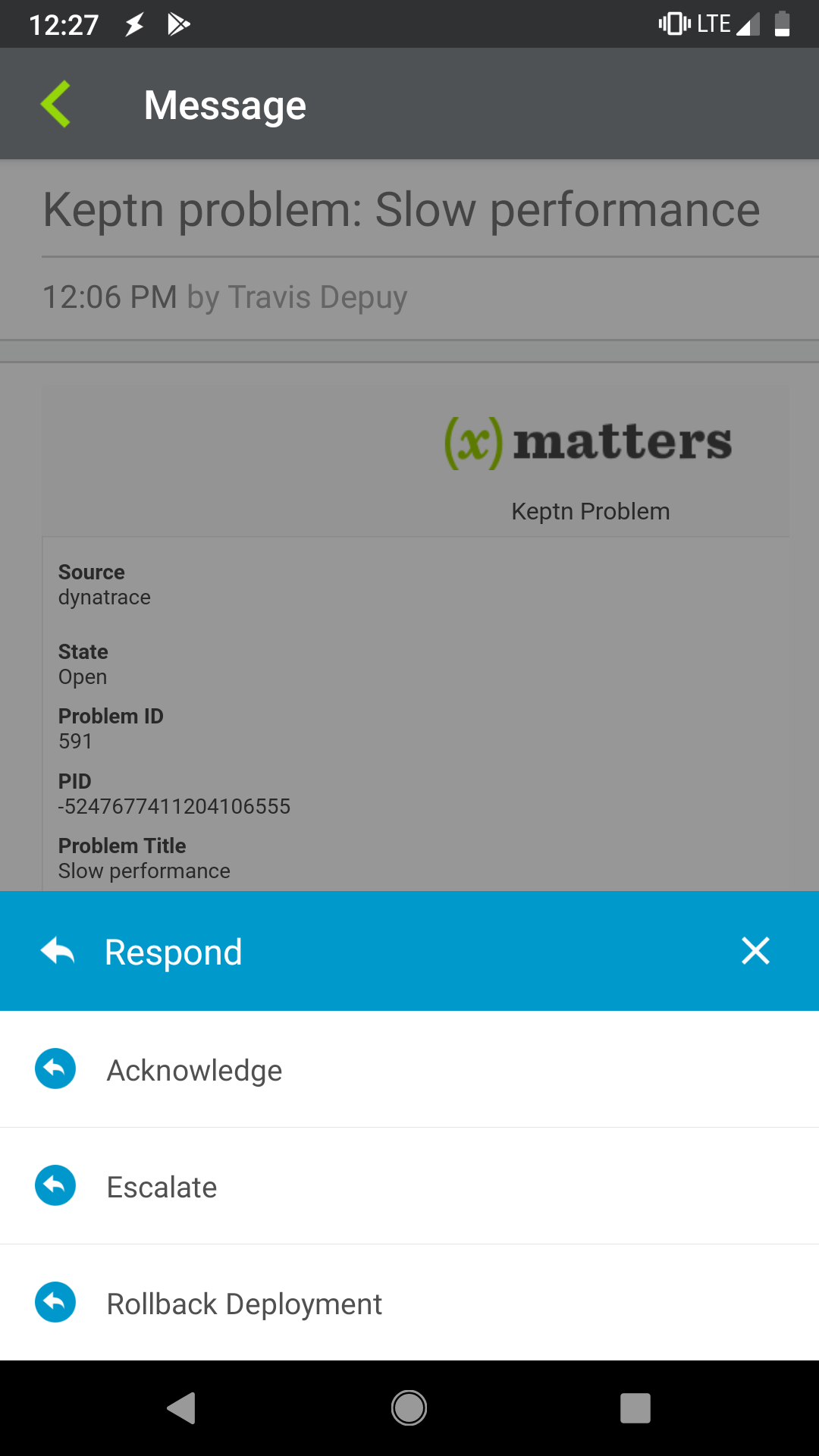 Per the remediation workflow built in xMatters Flow Designer, responders have the option to execute a rollback through keptn – all through their mobile devices.