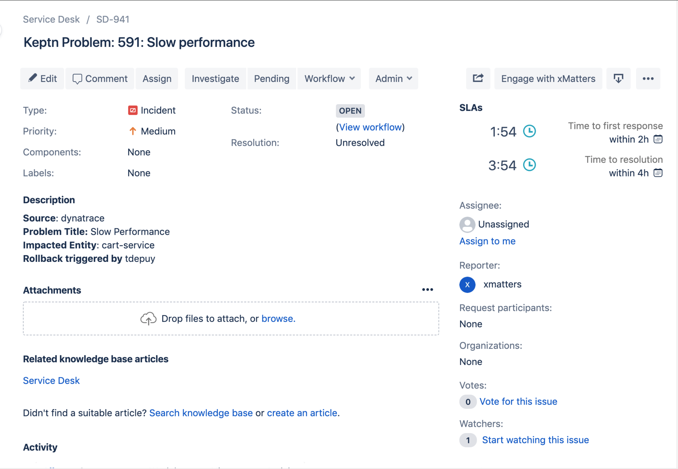 Within moments of pushing the xMatters response button to launch the remediation workflow, the rollback to the previous, stable version in the green environment is executed through keptn, fixing the issue just minutes from detection. With the incident resolved, the related chat channels and service desk issues are automatically closed.