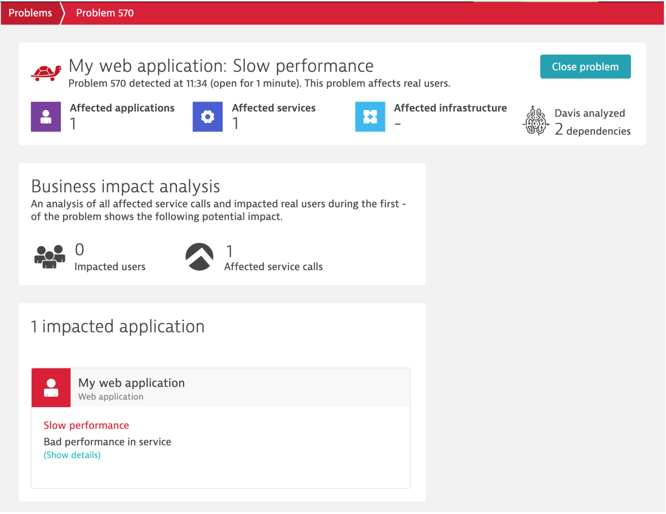 Dynatrace detects the affected application and services and their Davis AI-engine surfaces dependencies.