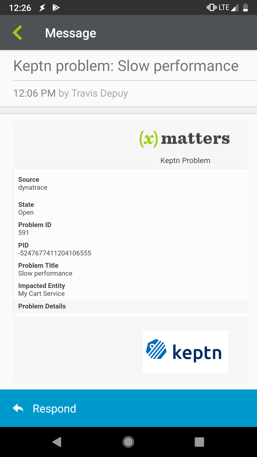 The code that was shipped may have passed pre-deployment rounds of testing, but it’s now impacting other services running. The team must take Immediate action to revert to the previous version in the parallel, green environment with Dynatrace’s keptn. In the words of Andreas Grabner of Dynatrace, this new product “…not only orchestrates Continuous Deployment, but it also orchestrates Continuous or Automated Operation.” So, as Dynatrace surfaces the incident, keptn simultaneously captures the issue data and triggers an xMatters workflow. This allows the developer on-call to take swift action and fix the problem.