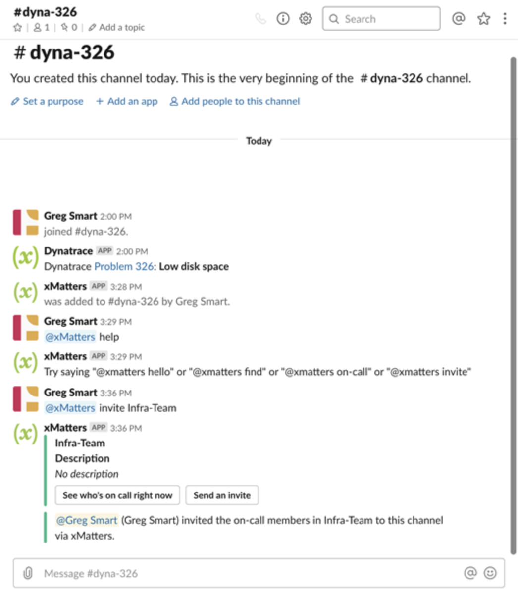 After starting a dedicated Slack channel, the xMatters Slackbot pulls the on-call database to invite the right resources to the channel,