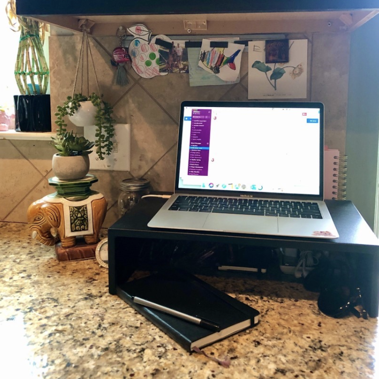 I still wanted to feel like I had an “office” or designated work setup, so I’ve since set up a space on my kitchen counter (a sort of standing desk) and designated our dining table as my seated (or web conference call) workspace.