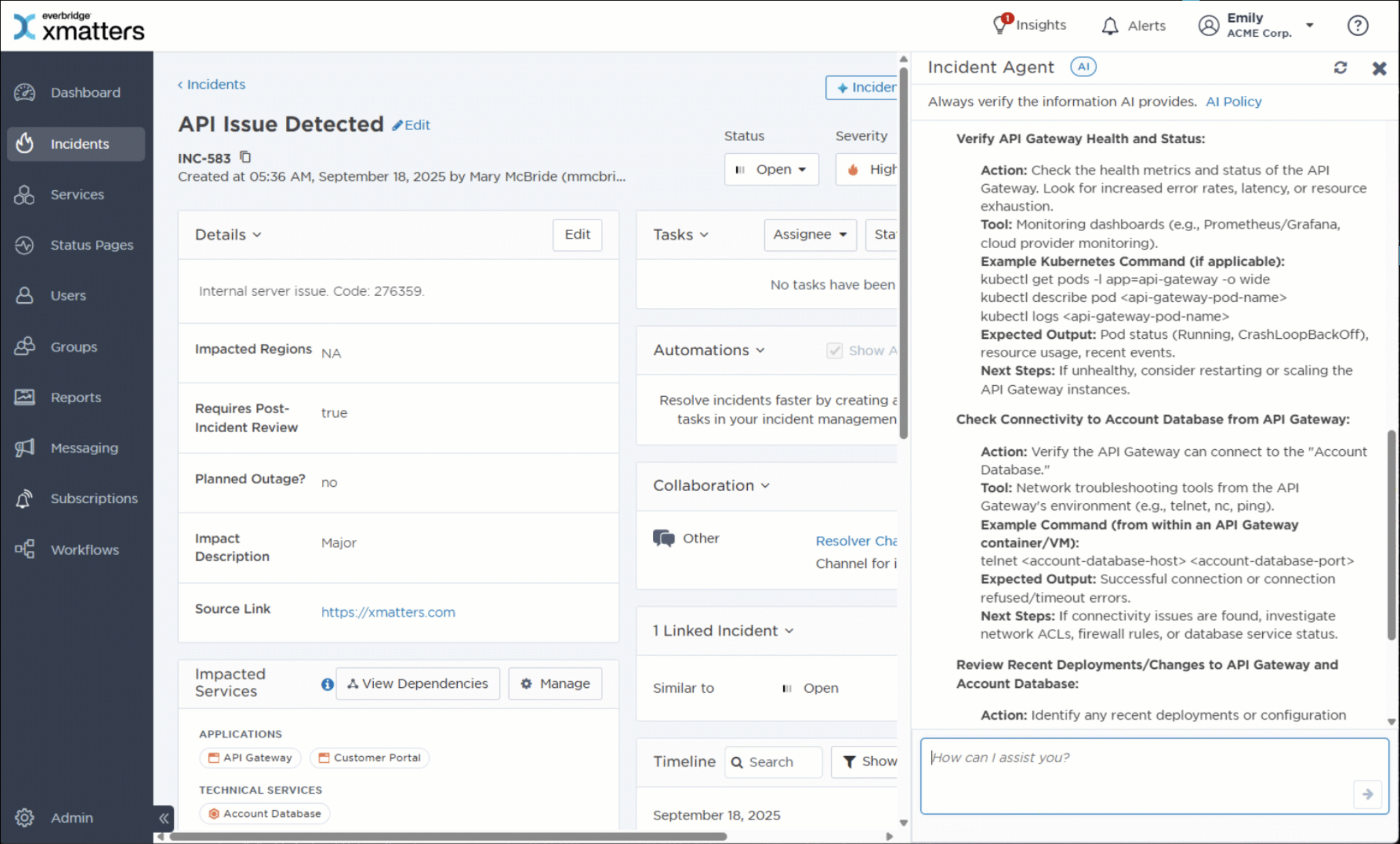 Incident response has always been a team sport. xMatters already makes it easy to collaborate across Slack, Teams, and other systems. Now, the AI Agent takes that a step further by recommending who to pull in, summarizing the conversation so far, and even suggesting how to communicate updates to executives or customers.