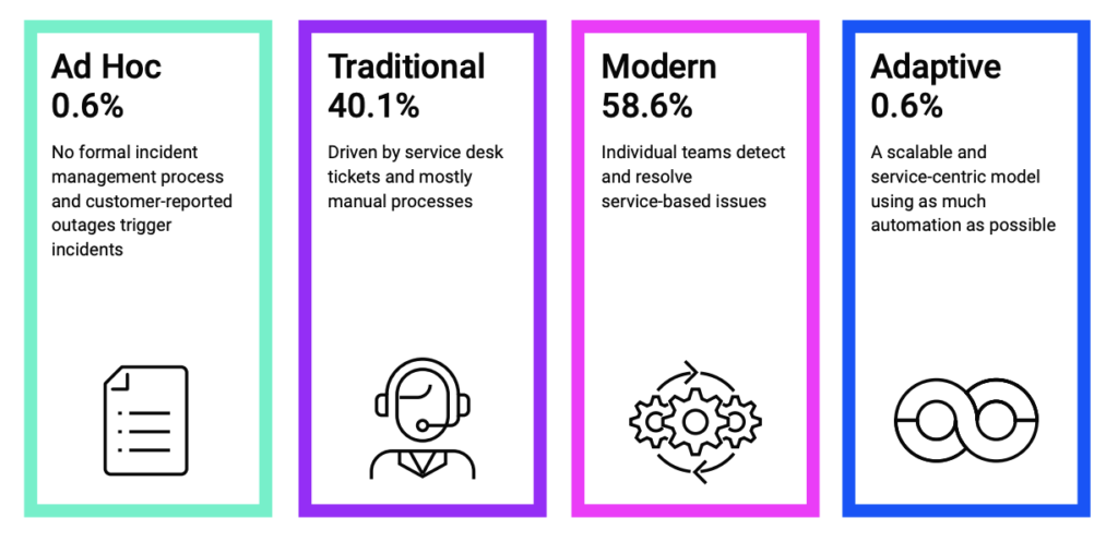 The study reveals that incident management needs its own transformation. Most companies scored as traditional or modern, but few achieved the highest level of maturity. There is good reason to strive for it, though. The more evolved an enterprise is on the Incident Management Spectrum, the more likely they are to have: