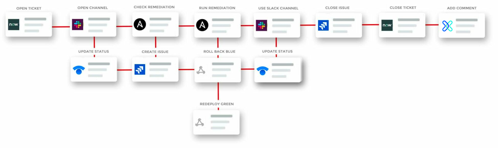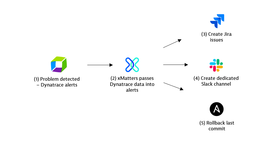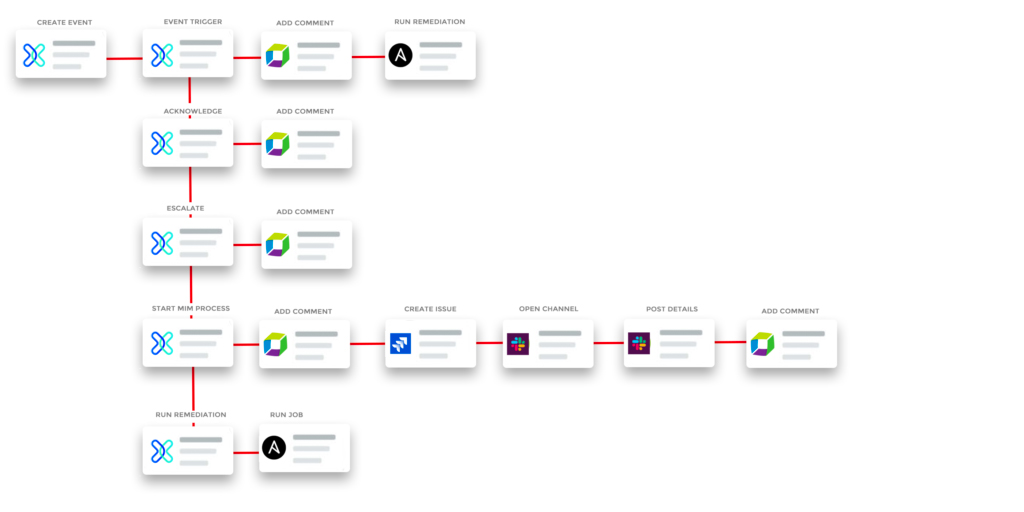 In the example above, xMatters uses its Slack integration to post to a channel to acknowledge the issue. It executes a runbook through Ansible and creates a Jira ticket.